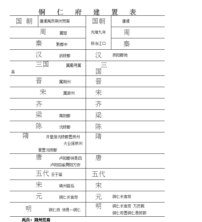 按通志:元置铜人大小江等处长官司,隶思州抚使。不言置自何时。考元史本纪:至元十四年,思州田景贤来附,授安抚使。二十年,讨平九溪十八洞,定其地之可以设官者,大处为州,小处为县,并立总管府,听顺元路宣慰使节制。二十一年,改思、播二州隶顺元路。二十九年二月以思、播二州隶湖广行中书省。铜仁之置,大约系二十年事。旧志:府城西南隅当大小江汇流处,有石,名铜岩,元时有渔者没水底得铜人三,挽而出之,府之名以此。明改铜人作铜仁,其实人仁古通用。