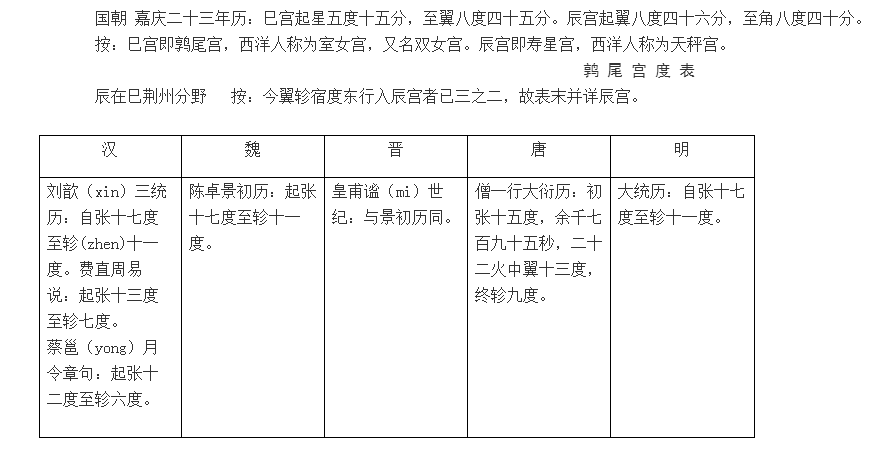 国朝 嘉庆二十三年历:已宫起星五度十五分,至翼八度四十五分。辰宫起翼八度西十六分,至角八度四十分。按:已富即鹑尾宫,西洋人称为室女宫,又名双女宫。辰宫即寿星宫,西洋人称为天秤宫。