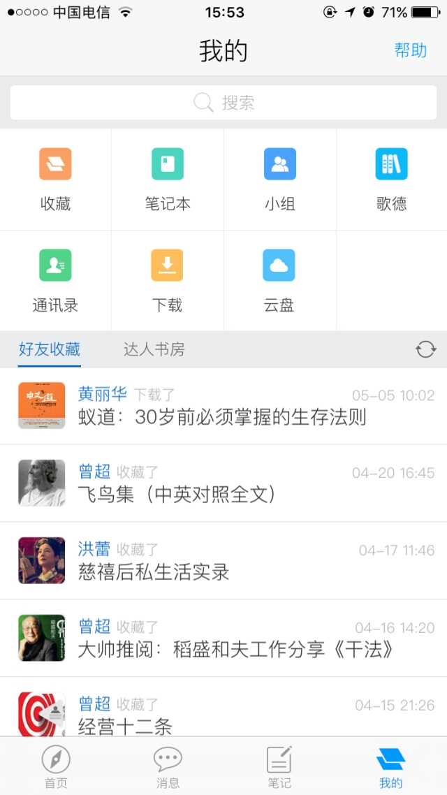 最后,读者们除了可查找书籍资源外,还有一些丰富的其他功能~ 点击消息,可进行接收和发送消息以及互加好友等~